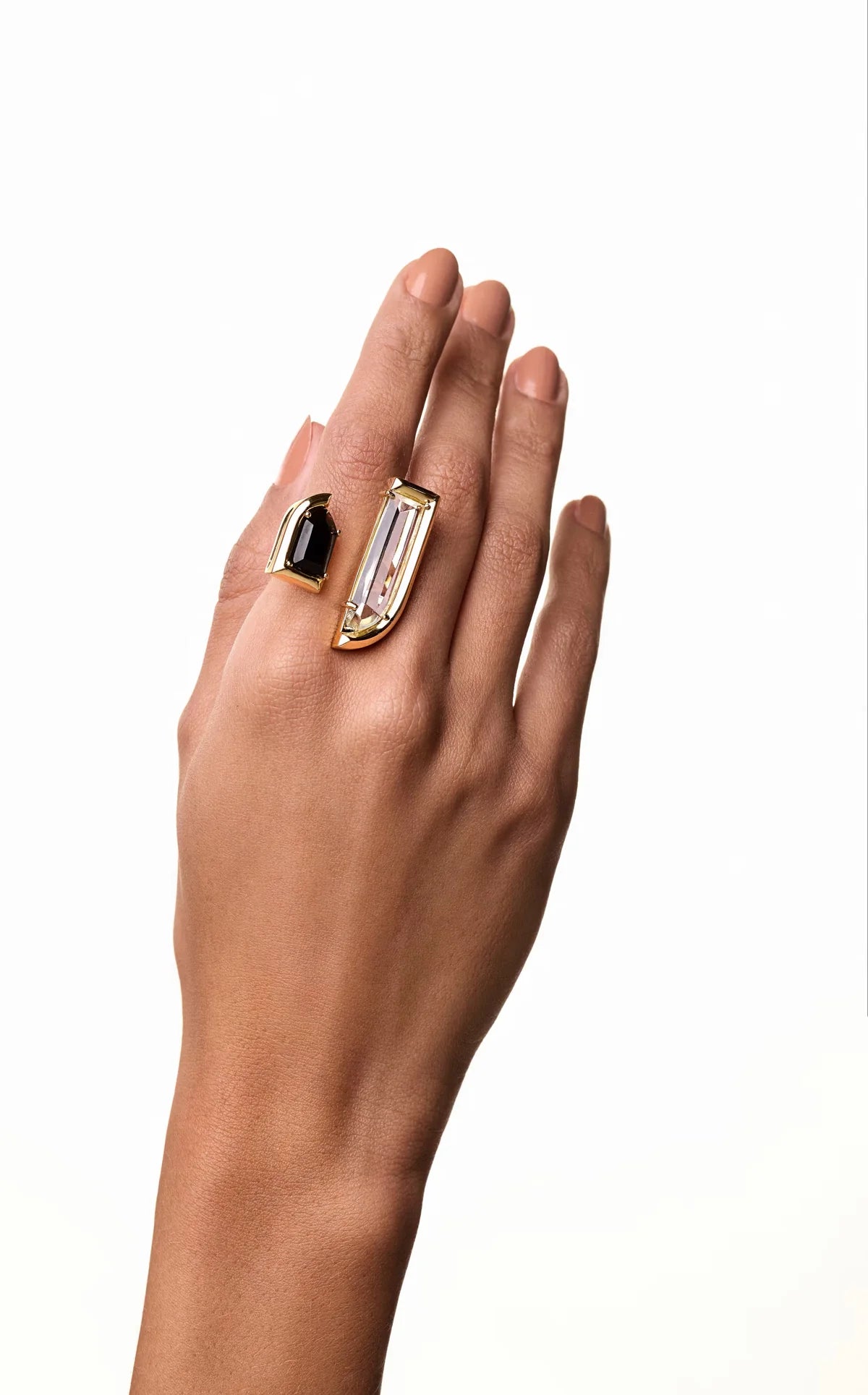 Anel que une ônix negro e quartzo cristal numa mesma peça com lapidações exclusivas e envoltos em metal liso e polido em banho dourado com o DNA da marca Anna Prata. A fusão das forças em equilíbrio, para quem já entendeu que não precisa escolher entre ser uma ou outra.
