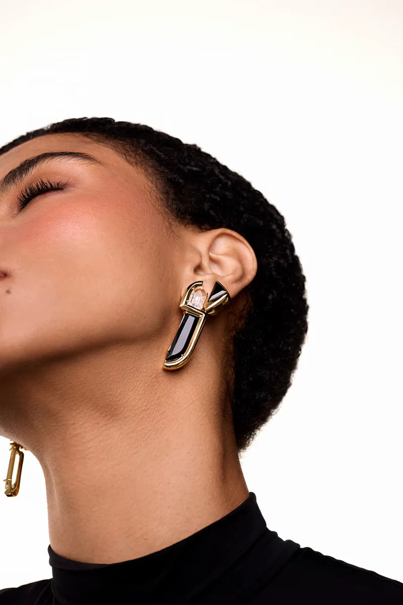 Brinco que une ônix negro e quartzo cristal numa mesma peça com lapidações exclusivas e envoltos em metal liso e polido em banho dourado com o DNA da marca Anna Prata. A fusão das forças em equilíbrio, para quem já entendeu que não precisa escolher entre ser uma ou outra.