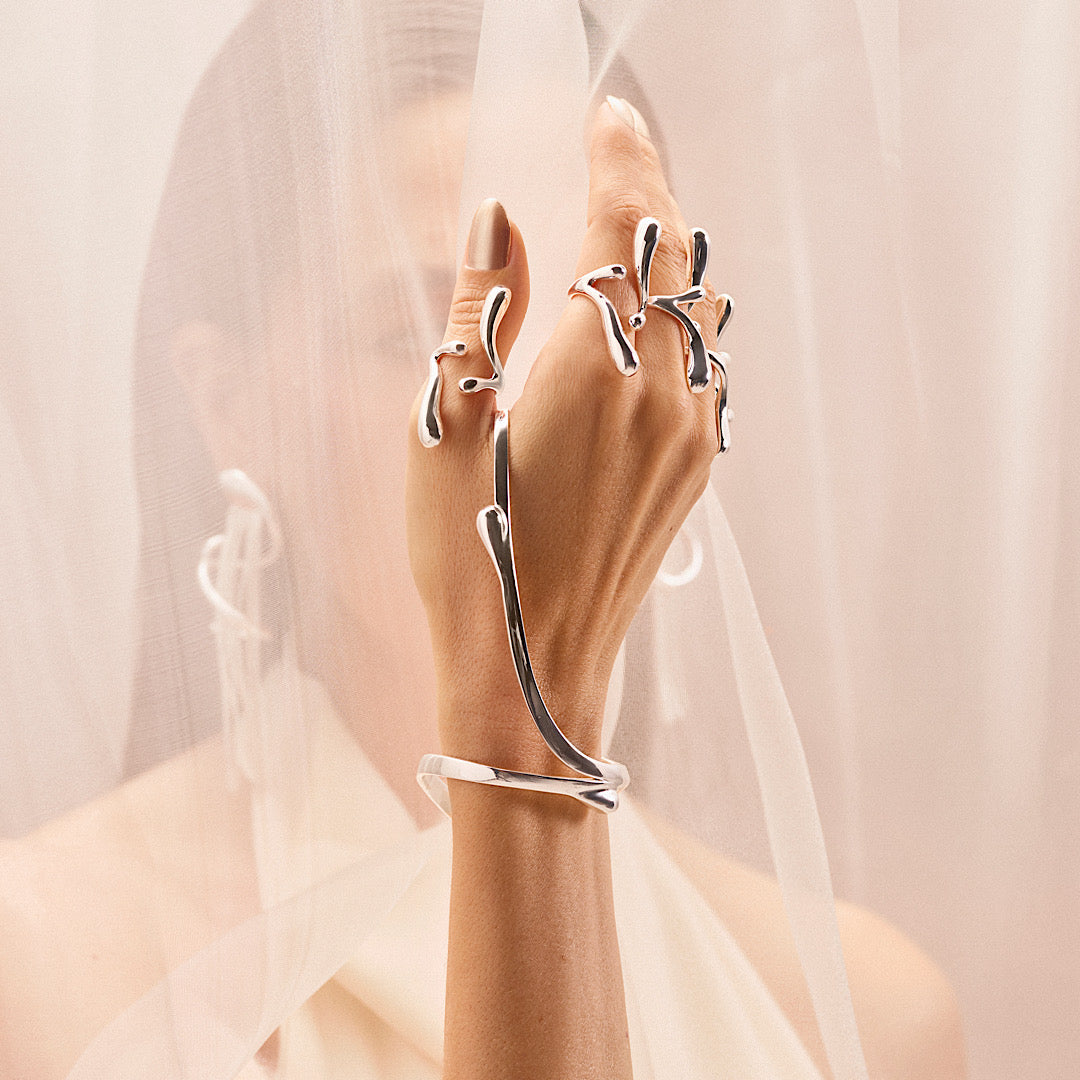 O metal escorrido, movimento fluido e a beleza do instante capturado traduzido em peças expressivas e modernas, a contemporânea pulseira de mão traz um ar moderno para essa coleção, acompanhando o design orgânico e minimalista de gotas de metal.
